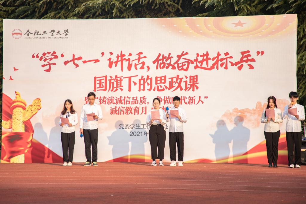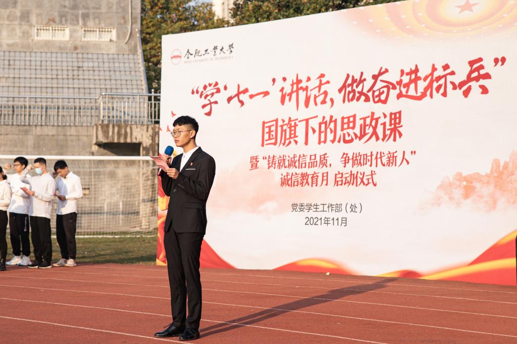 随后,学院2020-21学年国家奖学金获得者材料成19-2班王国强同学做国旗下的思政课《学习习近平总书记“七一”重要讲话精神,传承红色基因做新时代工大有为青年》主题演讲,王国强同学以习近平总书记在七一讲话中深情寄语新时代的中国青年以“实现中华民族伟大复兴为己任,增强做中国人的志气、骨气、底气,不负时代,不负韶华,不负党和人民的殷切期望”为主题,呼吁全体学子学习专业知识和党史,增强专业本领,努力做社会主义合格建设者和可靠接班人。王国强领誓全体同学“铸就诚信品质,争做时代新人”致6165cc金沙总站检测中心全体学生承诺书,在场学生跟读,势如长虹。