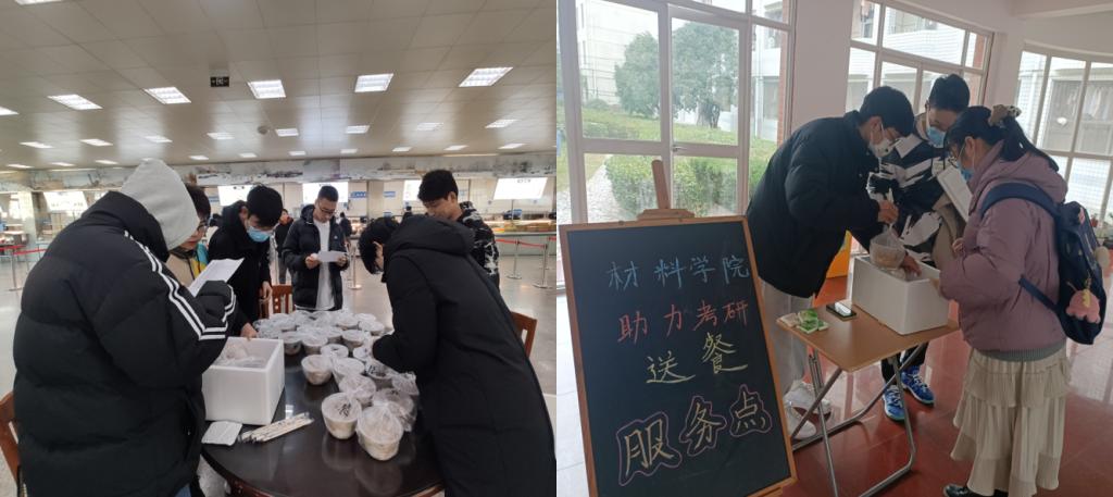 基础保障,前程无忧。为了解决考研期间自习教室少、休息时间短的问题,6165cc金沙总站检测中心设立考研自习室三间,于12月24-27日间为考研学子开放;同时,招募学生党员组建立“助力考研送餐队伍”,提前了解考研学生用餐需求,并为其购买配送至宿舍楼下,极大的节约学生用餐等待时间,令考研学子在考试期间安心考试,有效休息。