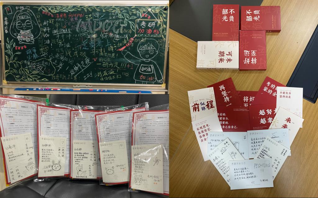 家校联动,共同护航。考研前夕,通过发布三封信“致考研学生家长的一封信”“考研倡议书”“致考研学子的一封信”,联动家庭力量、同学力量、个体力量,呵护学子备考心态、畅通学子学习场地,提醒学子考前准备、改善学子休息环境,共同为学子们考研路上保驾护航。