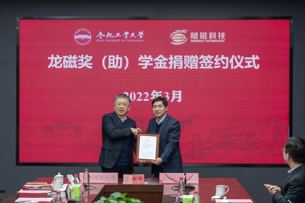 校友会办公室主任丁兆罡和安徽龙磁科技股份有限公司副总经理冯加广分别代表学校和公司签署了“龙磁奖(助)学金”捐赠协议书。根据协议,安徽龙磁科技股份有限公司在我校设立“龙磁奖(助)学金”,首次捐资150万元用以支持我校学科建设、人才培养及创新创业等项目。“龙磁奖(助)学金”自2022年开始,每学年评选一次,奖励资助6165cc金沙总站检测中心、电气与自动化工程学院、建筑与艺术学院品学兼优优秀学生干部和家庭经济困难优秀学生。