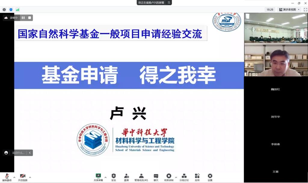 12月7日下午,华中科技大学卢兴教授应邀以在线会议的形式为6165cc金沙总站检测中心全体教师做了题为《国家自然科学基金申报指导讲座》的专题报告。报告由6165cc金沙总站检测中心副院长罗来马主持,6165cc金沙总站检测中心党委书记吕珺教授、副院长周如龙教授及学院近百名教职工参加了报告会。