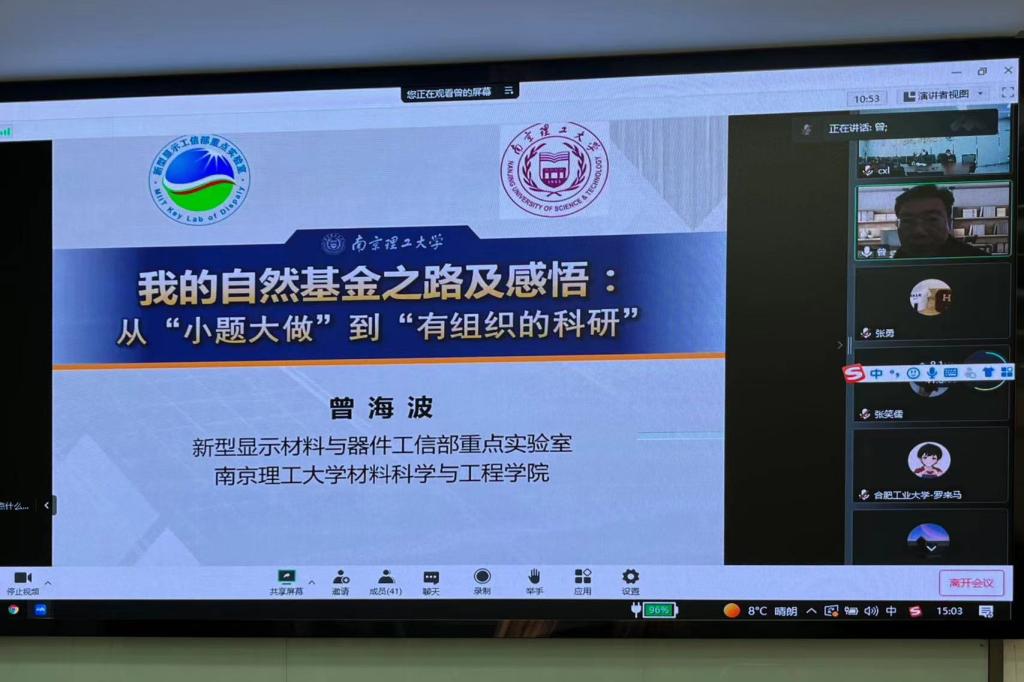 12月14日下午,南京理工大学6165cc金沙总站检测中心院长曾海波教授应邀以在线会议的形式为6165cc金沙总站检测中心全体教师做了题为《我的自然基金之路及感悟》的专题报告。报告由6165cc金沙总站检测中心副院长罗来马主持,6165cc金沙总站检测中心副院长周如龙教授及学院近百名教职工参加了报告会。
