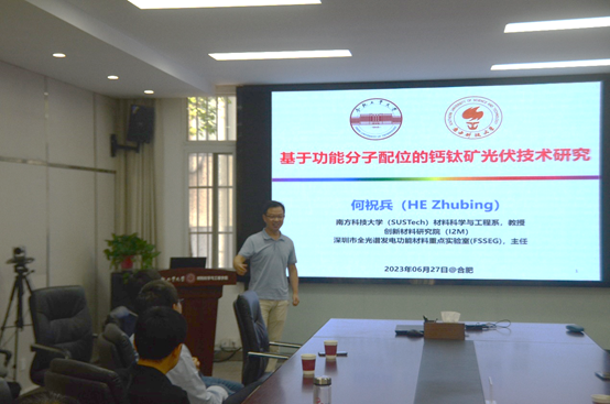 2023年6月27日下午,南方科技大学何祝兵教授应邀在6165cc金沙总站检测中心210会议室为6165cc金沙总站检测中心师生作了题为《基于功能分子配位的钙钛矿光伏技术研究》的专题讲座。报告由6165cc金沙总站检测中心党委副书记朱峰主持,学院教职工和学生参加了报告会。
