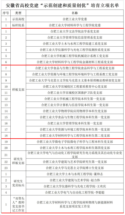 近日,安徽省委教育工委公布第二批全省高校党建“双创”培育创建单位名单,我院在此次党建示范创建和质量创优工作中获得佳绩。学院党委入选全省高校党建工作“标杆院系”,金属材料工程系教师党支部、本科生第二党支部入选全省高校党建工作“样板支部”。同时,学院材料物理与新能源材料系教师党支部获批安徽省高校“双带头人”教师党支部书记工作室。