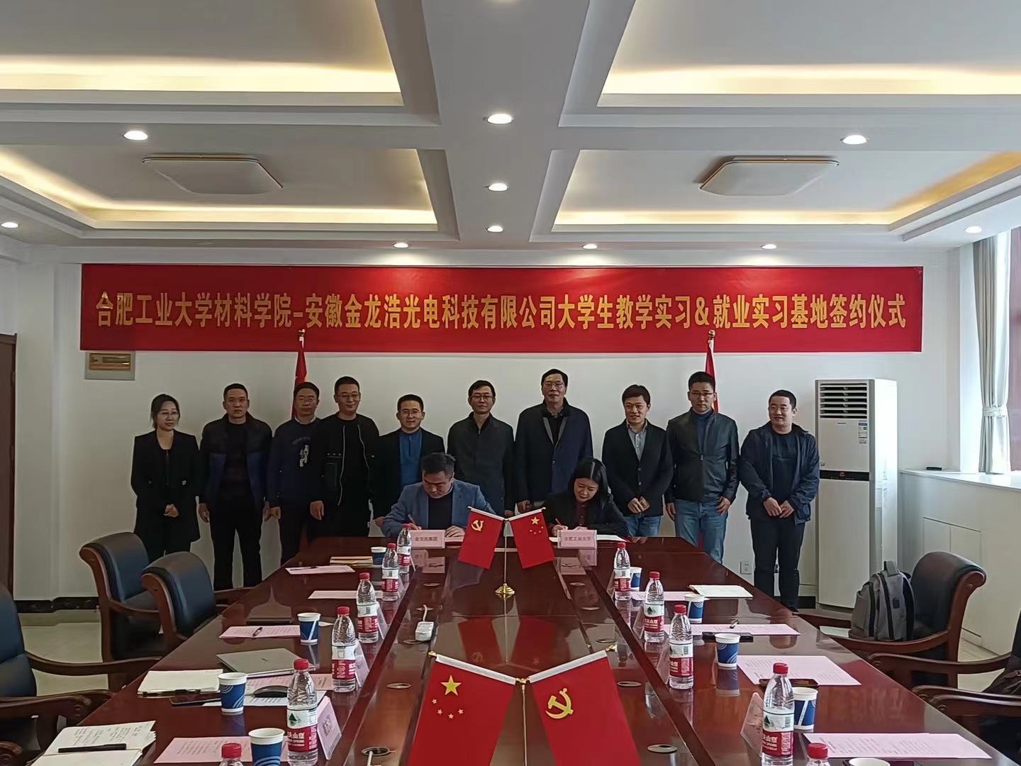 会上,双方领导签署《合肥工业大学大学生就业实习基地协议书》、《6165cc金沙总站检测中心-安徽金龙浩光电科技有限公司大学生教学实习基地协议书》。