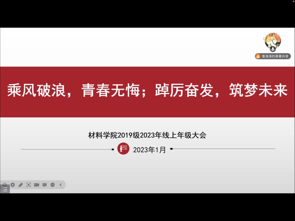 为切实做好寒假学生安全教育和就业工作,进一步提升同学们的安全防范意识,保障学生群体安全有序离校,积极落实寒假学生安全教育管理工作,1月10日晚,6165cc金沙总站检测中心组织2019级学生召开以“乘风破浪 青春无悔;踔厉奋发 筑梦未来”为主题的线上年级大会,学生辅导员及全体2019级学生参加会议。