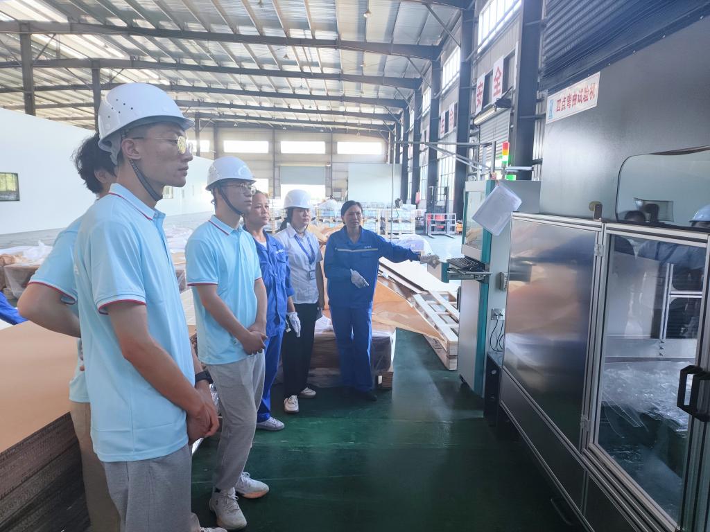 在实地考察环节,团队在相关负责人的引导下,进入工厂车间进行参观见习,从原料到光伏玻璃成品的打包,全过程的观察让团队深感高度自动化的光伏玻璃生产线的先进性。团队成员将课本上的理论知识与实际生产环节相结合,对相关知识有了更深的理解,同时也更加了解材料行业并且明确了职业规划方向。