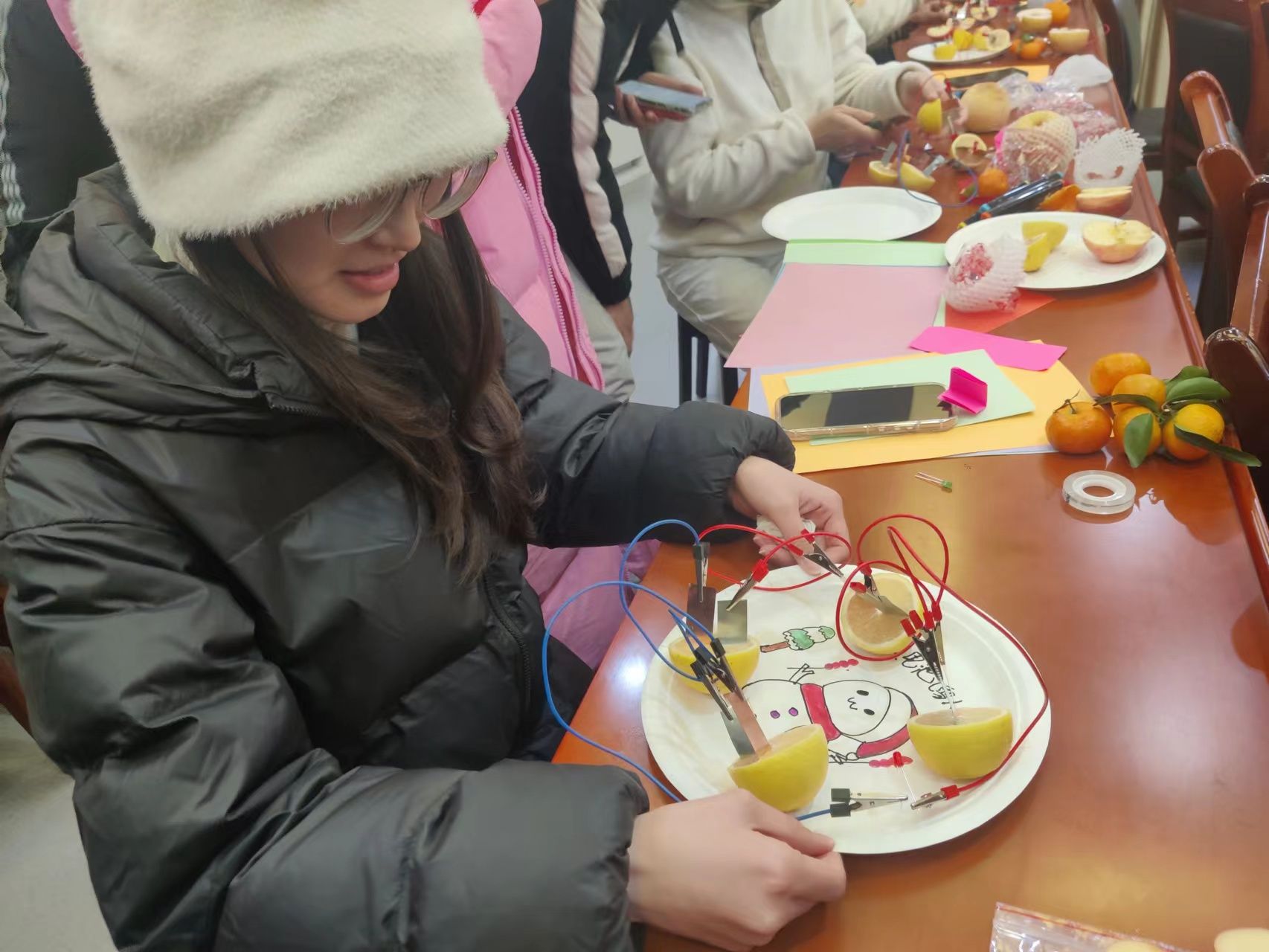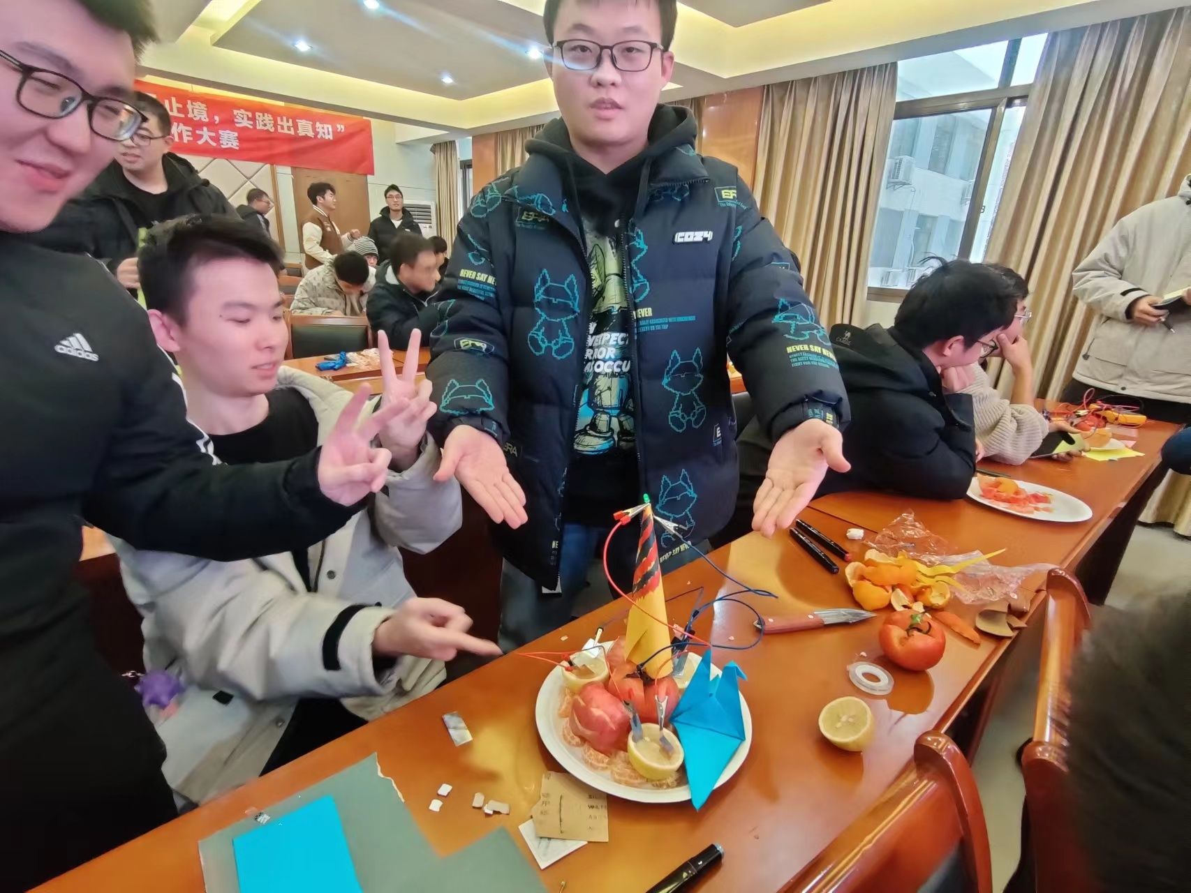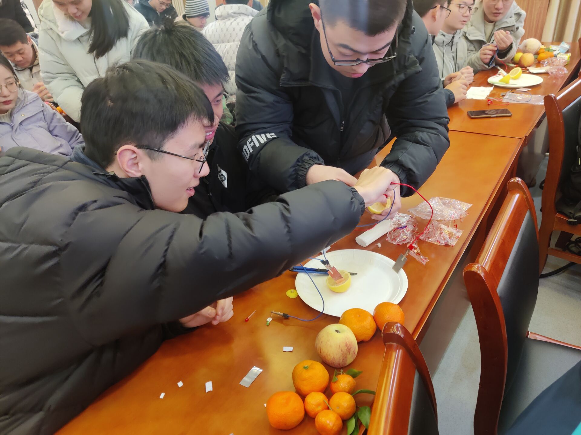 经过报名筛选,共有来自6165cc金沙总站检测中心和化工学院的20余支队伍参加。现场气氛欢快热闹,每支队伍都在构思自己的设计理念和原理,互相阐述着属于自己的理解,从橘子、柠檬、西红柿到梨子,从铜片、铝片、导线到彩纸,水果电池的结构逐渐清晰。在最终展示环节,参赛队伍纷纷阐述了各自电池的设计理念和独特寓意。评委团对每支队伍进行了电池知识的问答,参赛团队在问答中互相学习,共同掌握电池相关知识点,真正实现了实践创新与理论学习的有效结合。