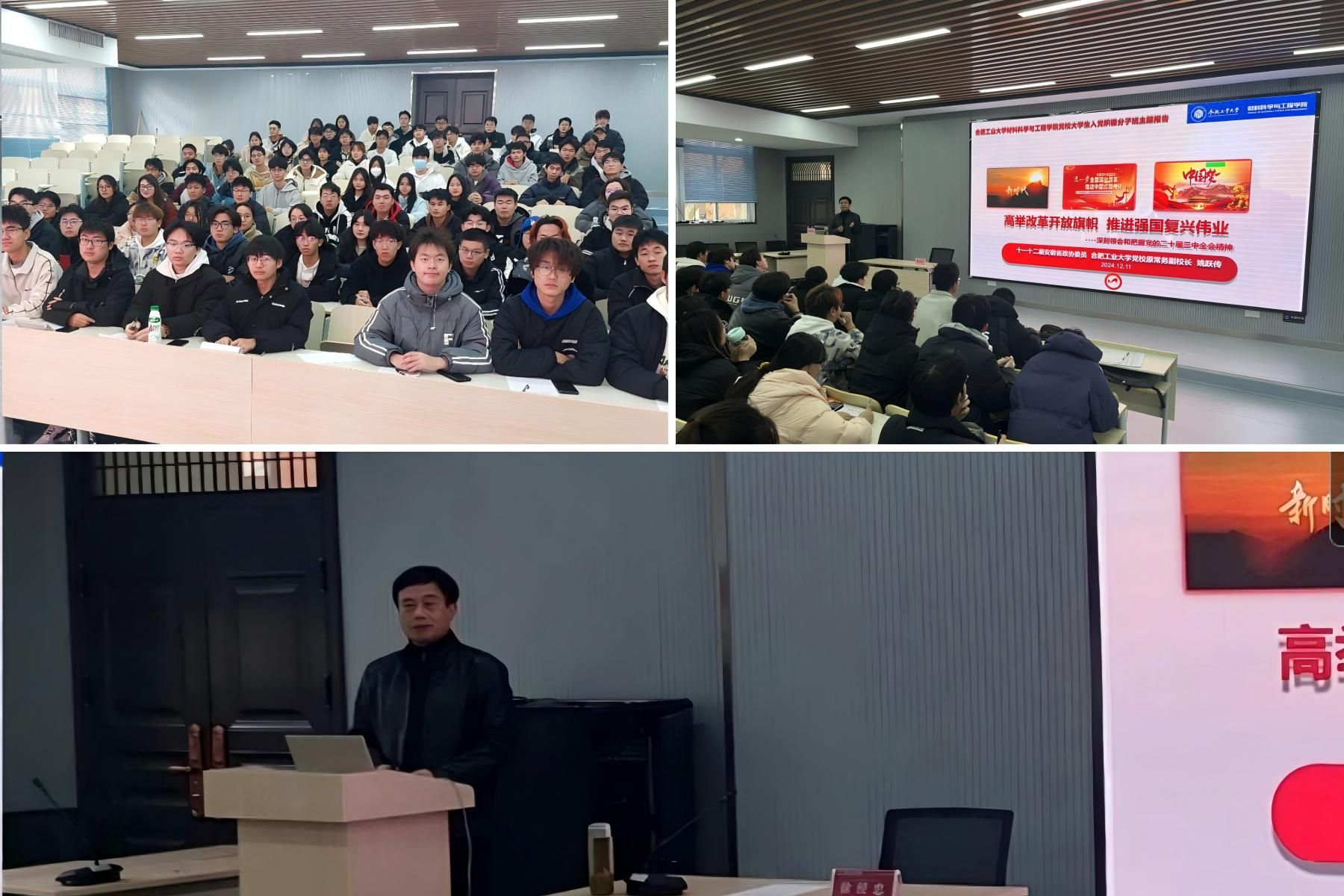 12月11日下午,为进一步加强对入党积极分子的培养教育,6165cc金沙总站检测中心举行分党校第72期大学生入党积极分子培训班第三次专题党课。十一、十二届安徽省政协委员、合肥工业大学党校原常务副校长姚跃传为积极分子作了题为《高举改革开放旗帜,推进强国复兴伟业——深刻领会和把握党的二十届三中全会精神》的精彩报告。