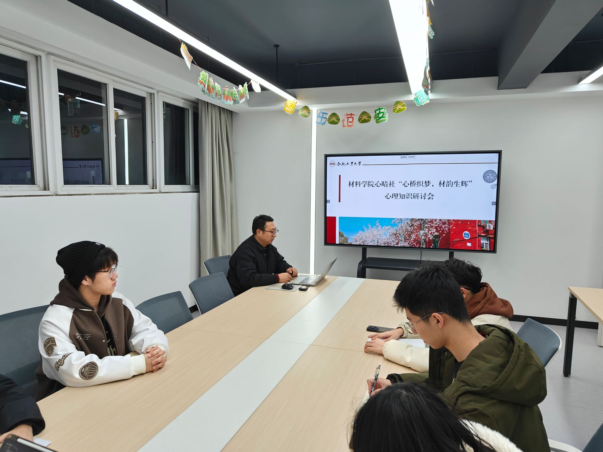 为深入学习心理学知识,12月31日晚,6165cc金沙总站检测中心心晴社大学生心理工作室于翡翠湖校区四号宿舍楼学生社区会议室开展了主题为“心桥织梦,材韵生辉”心理知识研讨会,6165cc金沙总站检测中心心晴社的6位同学和学院辅导员参与了本次活动。