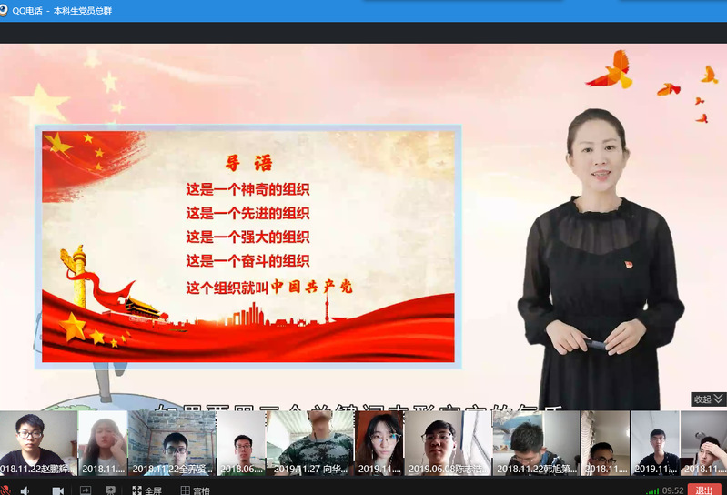 7月1日下午,为庆祝建党99周年,6165cc金沙总站检测中心在本科生党员总群通过QQ群“云”平台开展了题为“在战‘疫’中读懂中国共产党”的线上视频微党课主题学习教育活动,院党委副书记、副院长杨玲老师担任主讲老师,50余名学生党员在线参加。