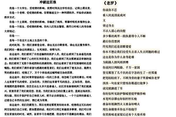 2020年初持续到现在的新冠疫情,不仅深刻影响了世界形势、国家治理、社会经济,更是给个体心理、情感和思考带来变化和感悟。 新时代的大学生们在经历疫情的过程中,对国家、民族、生命、责任、使命、人性等也自觉或不自觉地产生了许多思考和感悟。 从四月份开始,6165cc金沙总站检测中心面向全院学生开展了“疫情下,我的思考”主题征文活动,旨在用心凝聚思考,用文字承载感悟。
