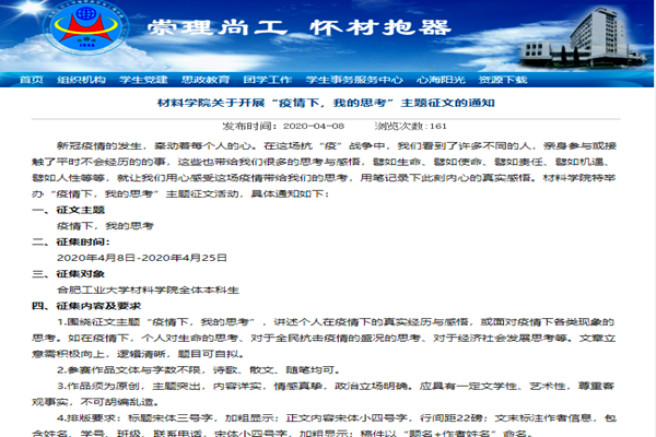 主题征文活动是6165cc金沙总站检测中心在疫情期间继续推进疫情期间第二课堂建设的系列活动之一。自活动开展以来,深受同学们喜爱与支持,激发同学们主动去思考自己在疫情中扮演的角色,将自己的感受以文字的形式记录下来。同时本次征文活动也体现出了新时代大学生们积极思考、不断探索的精神风貌,激发起了同学们的爱国热情!