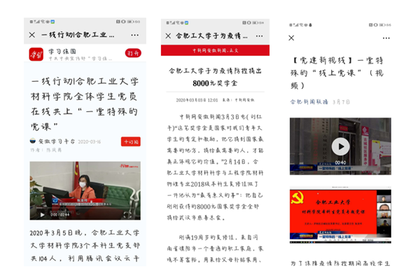 此外,学生党支部创新学习形式和内容,邀请一线抗疫英雄,合肥市三八红旗手、赴武汉金银潭医院支援抗疫的护师董芹芹和合肥市古城社区党委书记阮亚玲给学生上党课,用鲜活的抗疫事迹教育广大学生党员,先后获得学习强国、合肥电视台新闻联播报道。