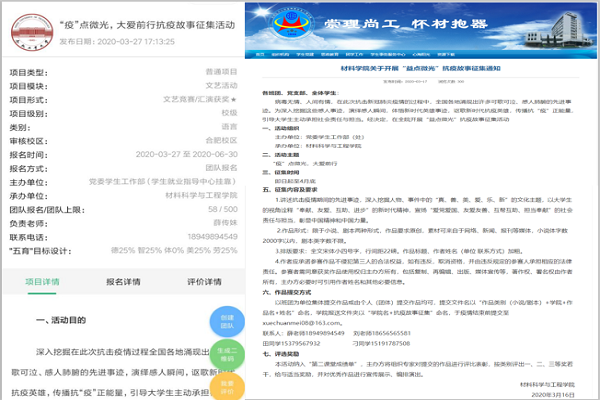 传承雷锋精神,讲述新时代雷锋故事——积极开展抗疫微故事征集活动。6165cc金沙总站检测中心依托第二课堂平台,在全院学生中深入开展“益点微光,大爱前行”抗疫微故事征集活动,鼓励学生在疫情期间讲述抗击疫情的先进事迹,深入挖掘人物、事件中的“真、善、美、爱、乐、新”的文化主题,以大学生的视角诠释“奉献、友爱、互助、进步”的新时代精神,宣扬“爱党爱国、友爱友善、互帮互助、担当奉献”的社会责任与担当,讲述新时代雷锋故事,体悟新时代英雄事迹,讴歌新时代抗疫英雄,传播抗“疫”正能量,活动开展过程中已有近200名同学报名参加。
