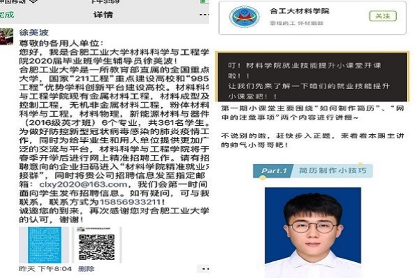 创新举措,精准服务,提升毕业生线上就业实效。面对新冠肺炎疫情,为了给毕业班学生提供更多更优质的就业机会,学院创新工作形式,加大“互联网+就业”的工作力度,建立“6165cc金沙总站检测中心精准就业对接群”,截止到目前为止,已与近70家企业取得联系,为网络精准就业做好充分准备。针对就业技巧方面,在毕业班成立了“就业技能提升小战队”,录制技能提升小课堂系列视频,为待就业的同学们提供就业经验分享,提高就业技能,提前做好迎接春招的各项准备。为帮助学生提高就业信心,毕业班辅导员还一对一在线帮助学生修改简历。一系列创新举措,大大提升了线上就业的实效。