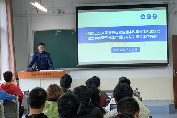 作为教务处和6165cc金沙总站检测中心共建党支部的内容之一,11月13日下午,注册中心积极组织了有关老师,到合肥的两个校区,为6165cc金沙总站检测中心有关年级学生介绍解读学校推荐免试研究生相关政策,以及2019版教学管理文件汇编中各项文件精神和要求,直接与同学们面对面答疑解惑,倾听意见建议,受到了广大同学们的好评。