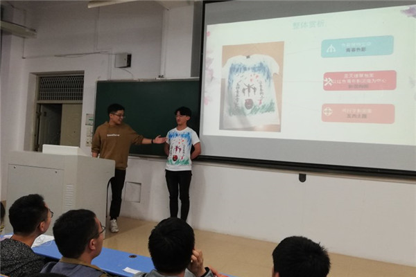 决赛分现场服装展示和作品答辩两个环节。服装展示环节,选手们穿上自己设计的创意文化衫,在舞台上对文化衫进行全方位展示,以此来彰显着青年人的青春活力。答辩环节,参赛选手们从文化衫图案设计的思路、理念、内涵等方面进行了详细的介绍,他们以自己的创意文化衫作品来表达了青年人对于五四精神的传承和发扬。