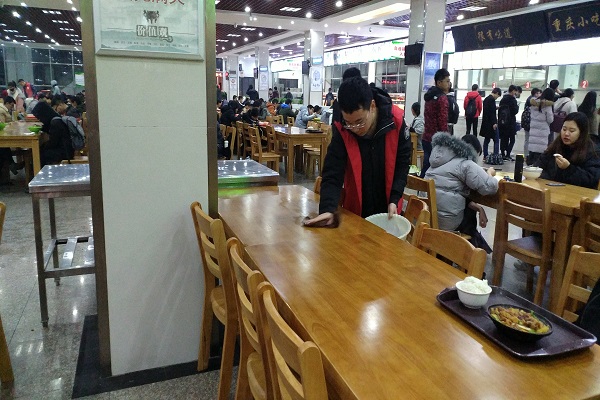 在团支书和班长的带领和组织下,班委们在几天前就已经开始策划这次活动了,终于在这一天将一切的策划变成了实践。同学们也积极参加,于下午三点三十分在第三食堂集合。随后,便开始了食堂的清洁工作,将个别散乱的桌椅摆整齐,将本已经很干净的餐桌擦的更干净。“你们来了真是帮了大忙了”,工作人员对着学生们说。