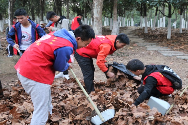 到达了清扫区域后,志愿者们以三人一组的形式进行了简单分工,迅速地确定了各小组的成员及清扫区域。志愿者们有的负责清扫落叶、有的相互配合将落叶装袋,一堆堆的落叶不一会填满了一个个编织袋。经过两个小时的奋力清扫,地上的落叶很快被清理的干干净净,公园的道路恢复了原有的整洁面貌。汗水滑下了志愿者们的脸颊,但他们脸上都洋溢着灿烂的笑容。