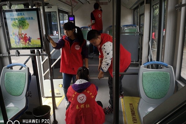 活动伊始,春晖社志愿服务部负责同学就本次志愿活动做了简单的分工和安排。随后,就公交清洁活动中的基本问题向公交站的工作人员做了现场咨询和了解。清洁现场秩序尽然,志愿者们有的清理座位下的死角,有的清理车厢地板,有的清理车体污渍,有的清理车窗。对一些卫生死角如空调出风口,窗槽,行李架等地方的灰尘也进行了全面清扫。同时,在车辆进出站的高峰时段,志愿者们以快捷、高效的方式确保了每一辆公交车的按时按点使出站台。长达4个小时的志愿清洁活动结束了,志愿者们脸上露出了灿烂的笑容。