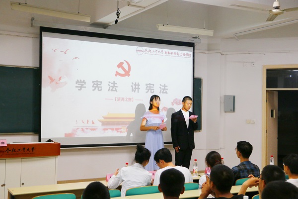 活动一开始,主持人对宪法进行了简要介绍,为正式比赛拉开了帷幕。在经过多天的充分准备下,九名参赛选手们在台上镇定自若,紧紧围绕三个中心——一是全民学法,促进全民知法守法护法;二是宪法的现实意义,以及宪法治国安邦作用;三是宪法的由来以及将来对宪法的补充和完善——进行了阐述,并提出了自己独到的见解。在演讲的过程中选手们舌灿莲花,妙语连珠,在与观众评委的互动中引发共鸣,一时学法知法热情高涨,台下掌。演讲完毕后,17级辅导员陈凤舞老师对此次比赛做了总结:“今年对宪法进行了最新修改,作为大学生,应知法尊法守法,所以比赛目的之一即为大学生普及法律、了解法律。另外,大学里有很多平台,望大家能够充分利用这些平台与机会,在大学得到成长!真切希望今后同学们能拥有一个更加充实、富有意义的大学生活。”