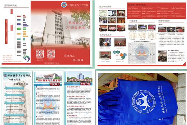 此次迎新,院青年新媒体中心在17级辅导员老师的指导下分别制作了学院介绍和专业介绍海报,6165cc金沙总站检测中心海报以院徽作为水印制作于海报正中央,海报版头以翡翠湖校区南门作为背景图片,凸显学校主体地位。专业介绍海报以组成材料的球棍分子模型作为水印,海报版头以材料楼为背景图片,强化专业认同。为展现6165cc金沙总站检测中心精品学生活动、品牌学生工作、特色学生组织和科技竞赛情况,院青年新媒体中心为学院每一位新生“私人订制”了带有学院特色的迎新专刊折页,折页封面以材料楼作为主图片,以主教楼砖红色作为主基调,学生组织构架版块制作院徽水印,强化学院自信,封面底脚和内页分别印制了学院院训和“双引领三融合”学生工作育人理念。