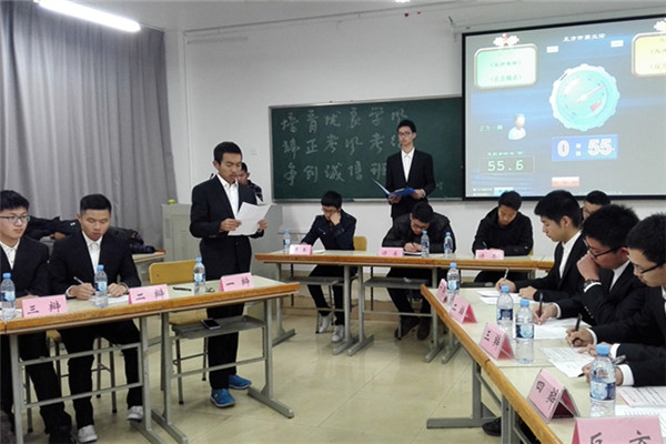 本次主题班会共设“学风主题辩论赛” 、 “学风考风主题教育”、“校纪校规知识测验”、“诚信考试承诺横幅签名” 等四个环节。