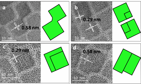 图2.高分辨透射电镜照片和相应的示意图显示了CsPbBr3量子点通过取向吸附机制形成后具有的不同外形。其中0.58nm和0.29nm分别对应为立方相钙钛矿CsPbBr3的(100)和(200)晶面。