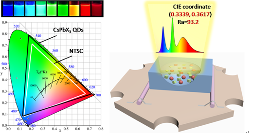 图1.不同成分CsPbX3量子点在UV-365nm紫外灯照射下的发光照片及其在1931-CIE色坐标中的色域显示(左图);基于CsPbBr3量子点的白光发光二极管的器件示意图及其性能显示(右图)。