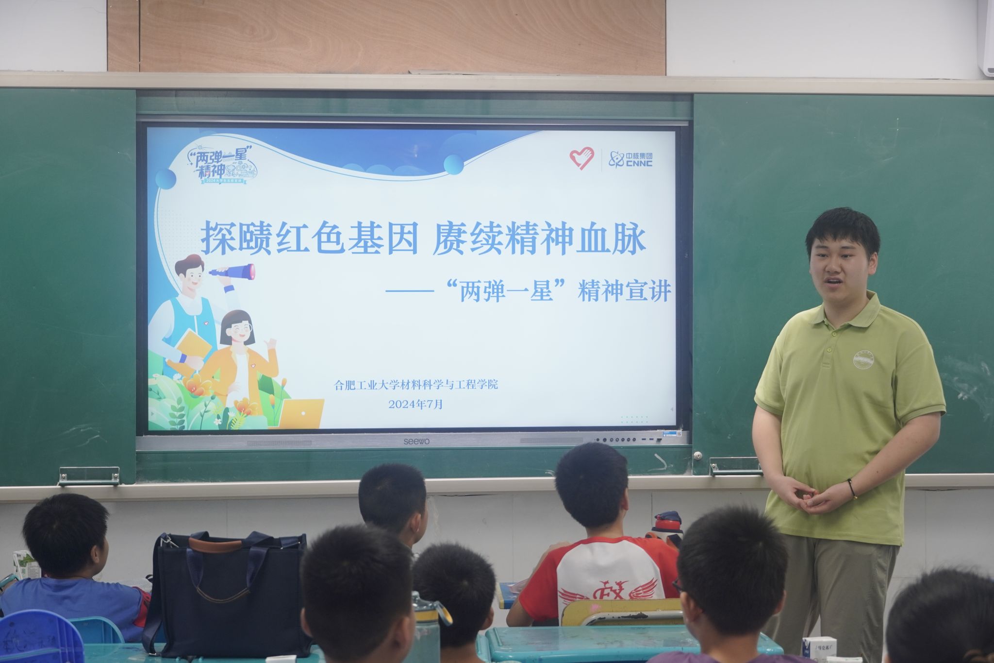 7月13日,6165cc金沙总站检测中心“探赜两弹红色基因,赓续先辈精神血脉”“三下乡”暑期社会实践团队联合6165cc金沙总站检测中心“青春飞扬,筑梦翱翔”大学生志愿支教团队,赴肥西县三河镇政府中心学校开展科普宣讲思政课。课程向学生们普及“两弹一星”精神内涵,引导学生们树立正确的价值观和人生观,厚植爱国情怀。