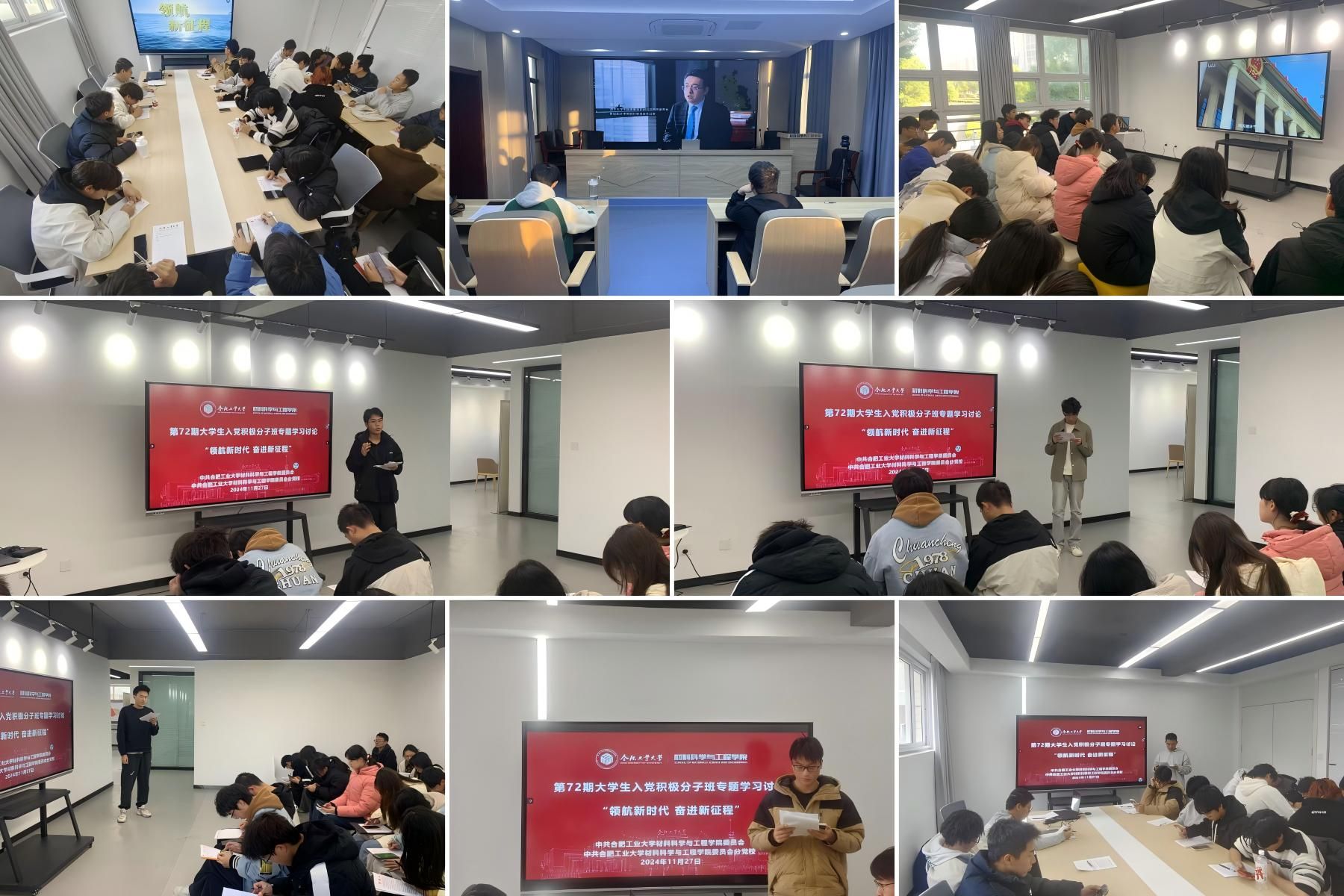 为深入学习贯彻党的二十届三中全会精神,加强对入党积极分子的培养教育,提升政治素养与理论水平,11月27日下午,6165cc金沙总站检测中心组织分党校第72期入党积极分子班于翡翠湖校区三号楼学生社区、屯溪路校区党员之家分别开展“领航新时代,奋进新征程"专题学习讨论。
