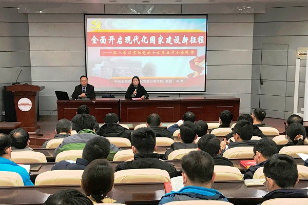 为进一步增强教职工的政治定力,切实将思想和行动统一到党的十九届五中全会精神上来,12月10日下午,6165cc金沙总站检测中心在斛兵报告厅举行十九届五中全会精神学习专题报告会。中共安徽省委党校决策咨询部主任、省委党校党的建设与国家治理研究院执行院长张彪教授应邀作了题为“全面开启现代化国家建设新的征程——深入学习党的十九届五中全会精神”专题宣讲。全院教职工、部分学生党员干部参加学习。